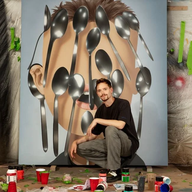 Oli Epp (b. 1994) is a painter living and working in London. Deformed, quirky and exuberant figures inhabit Oli Epp’s canvas, often staged within theatrical settings. Easy to read at first glance, these hyper-dramatised characters reflect upon our complex relationship to technology and social media. Epp’s idiosyncratic aesthetic fuses realistically painted details in oil with graphic techniques in airbrush and linear masking.